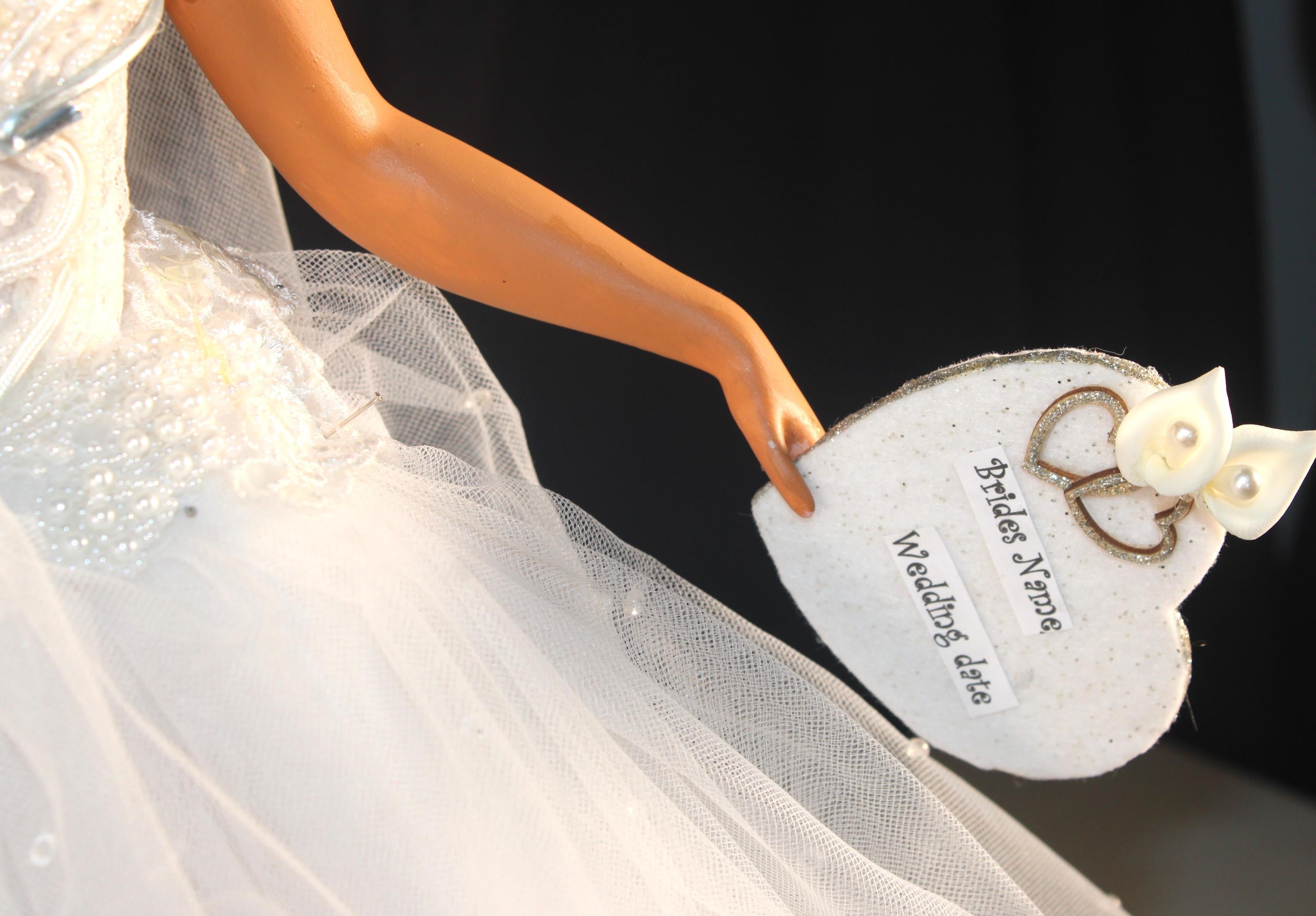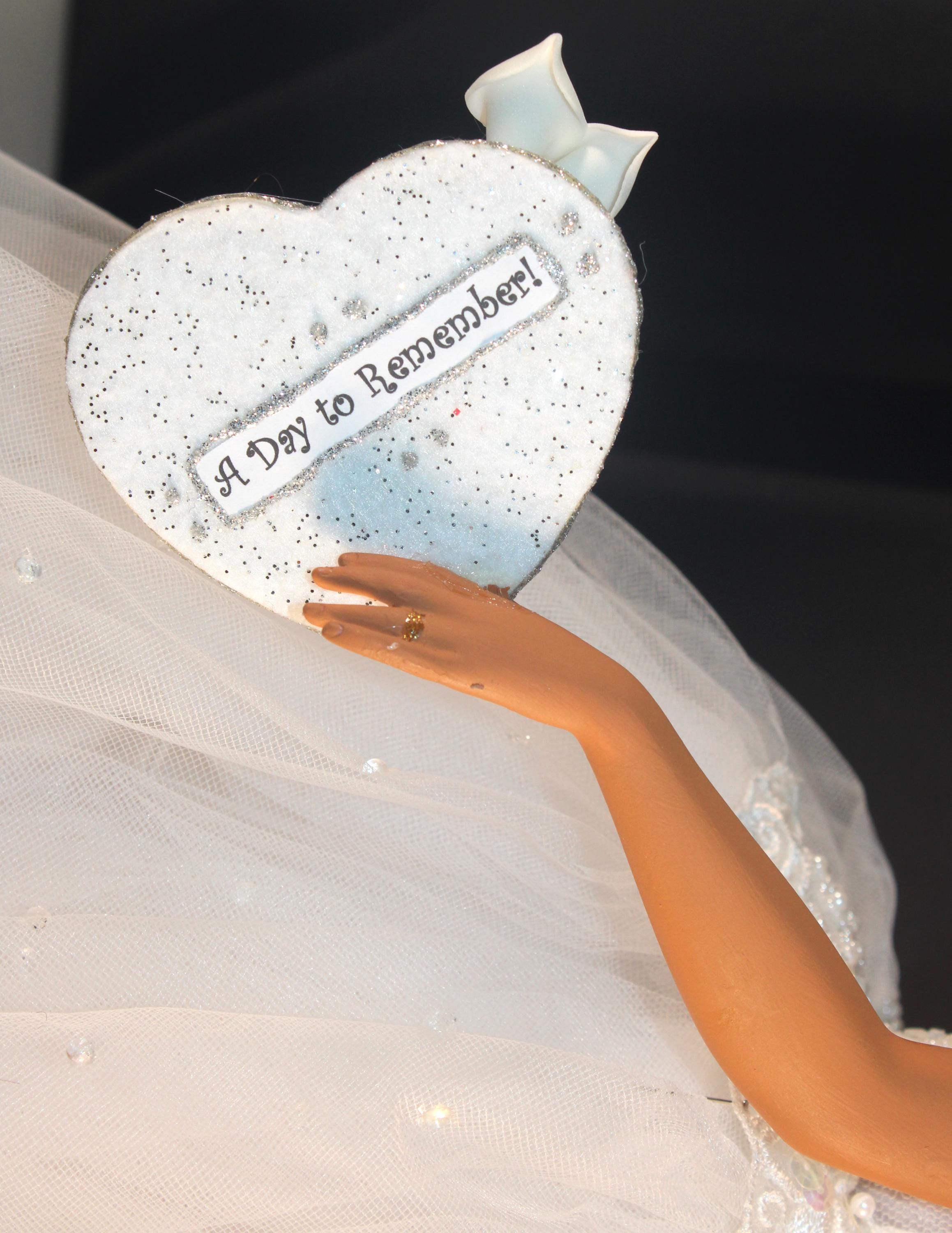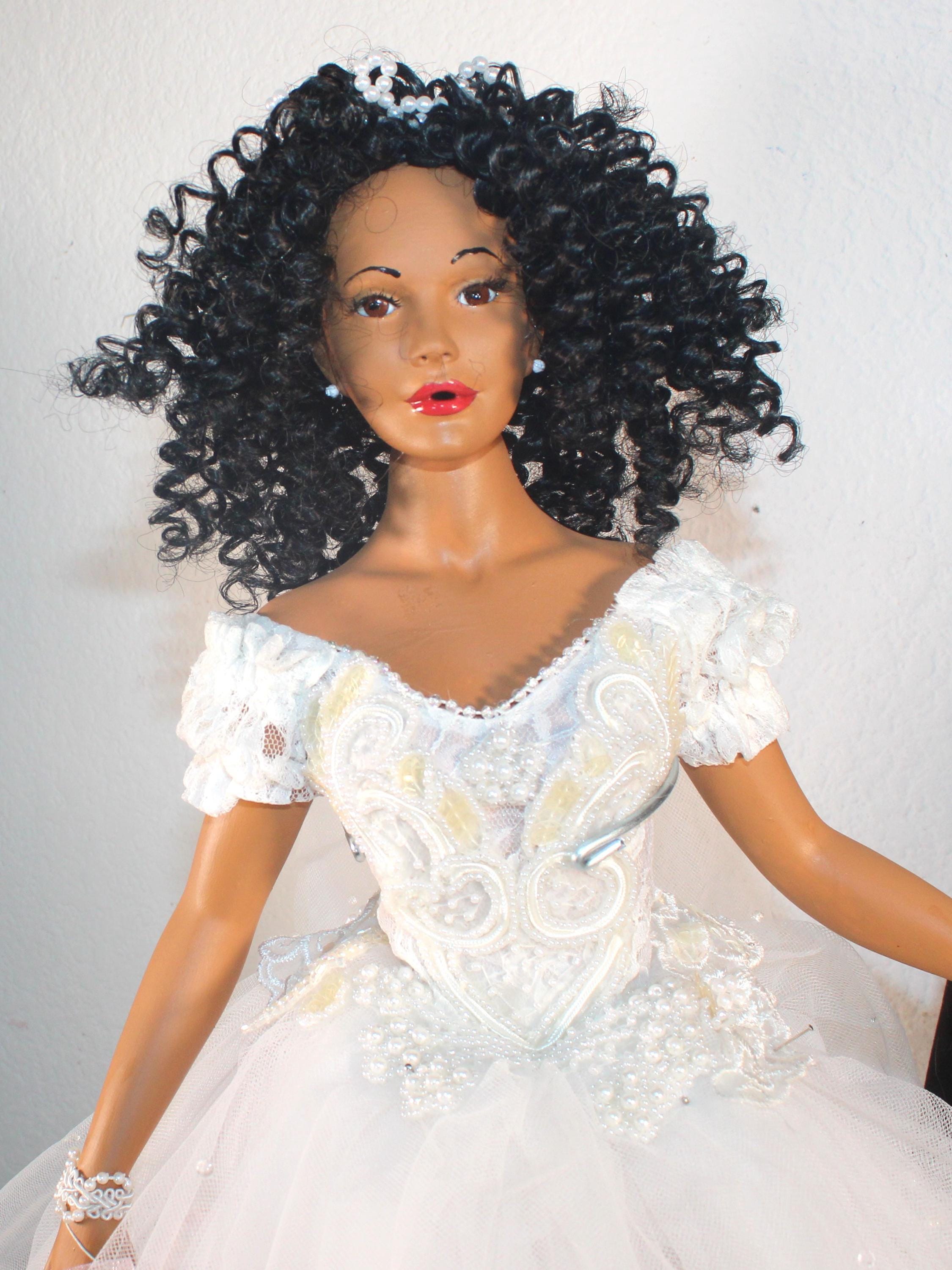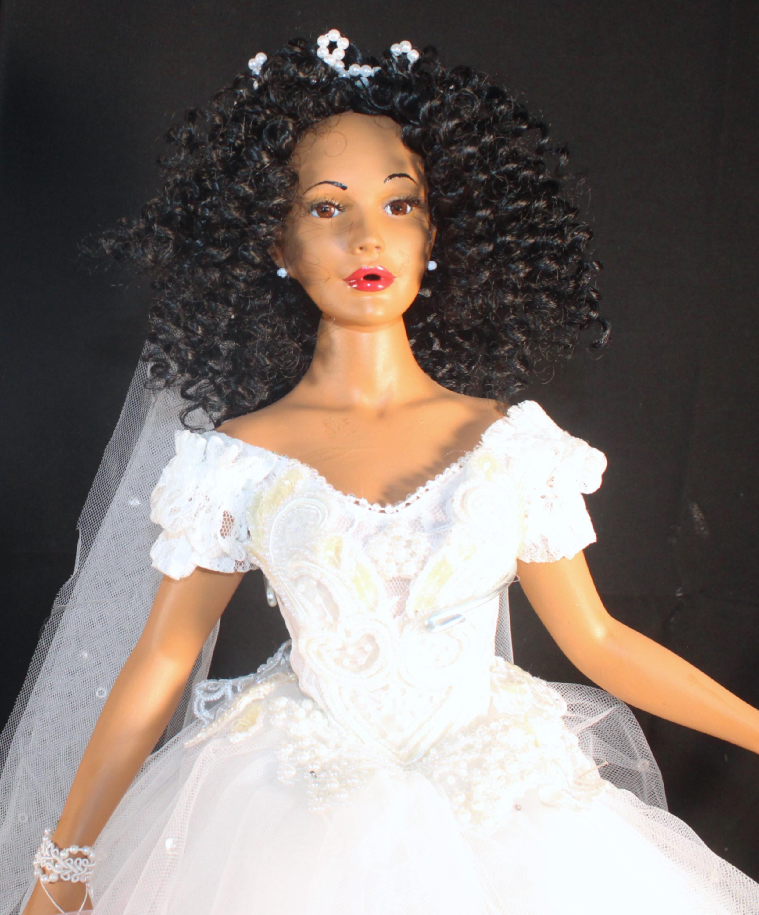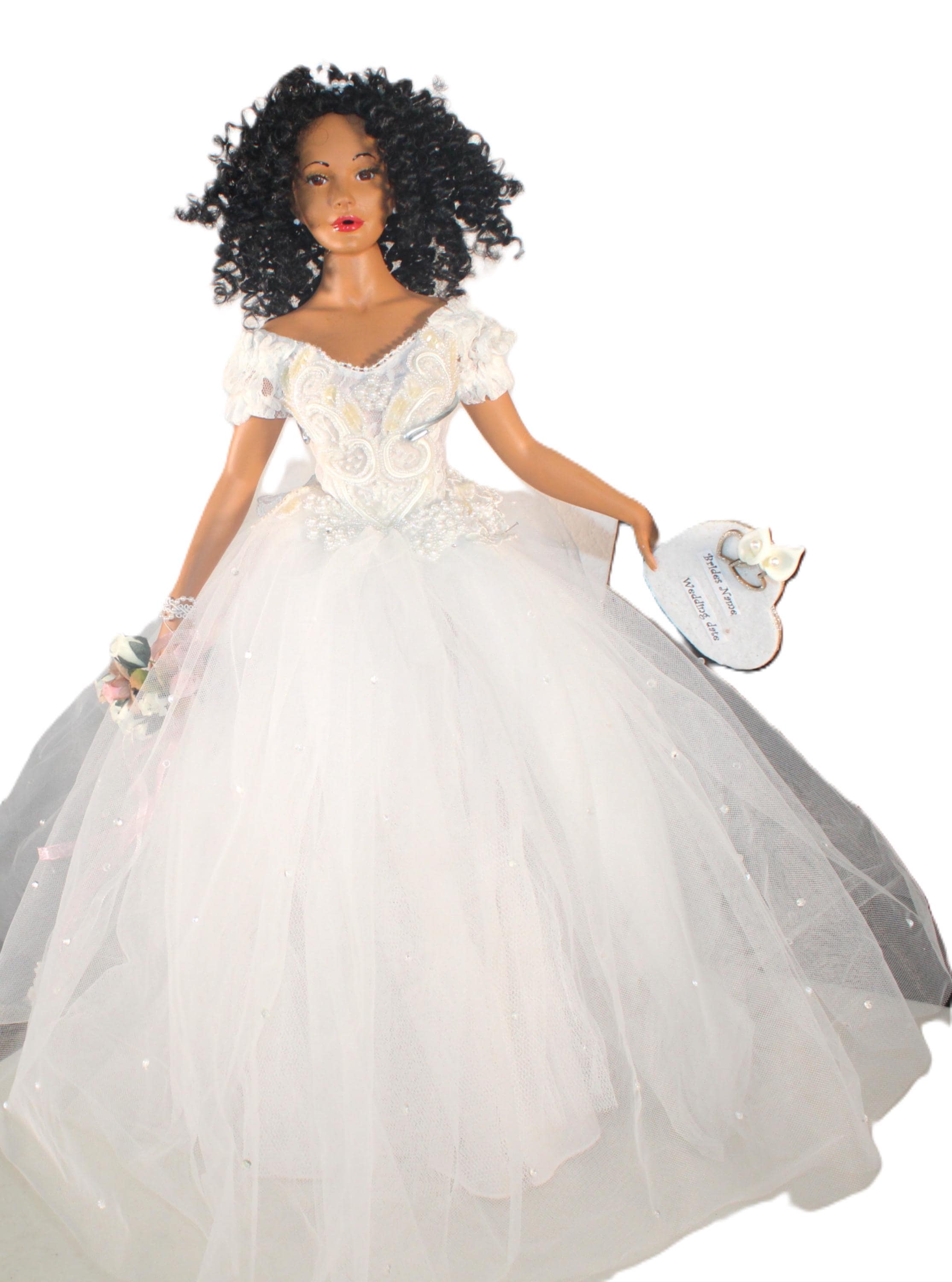 LYRIC....An 18" African American Porcelain commemorative bridal doll with the DATE TO BE REMEMBERED. Dressed in a beautiful white off the shoulder beaded gown and holding a heart that will be personalized with your brides name and the date of her wedding. A perfect shower/wedding gift for the bride who has everything. Made of handpainted porcelain and fabric. Long black kinky curly hair adorned with a beaded floral head piece and veil.