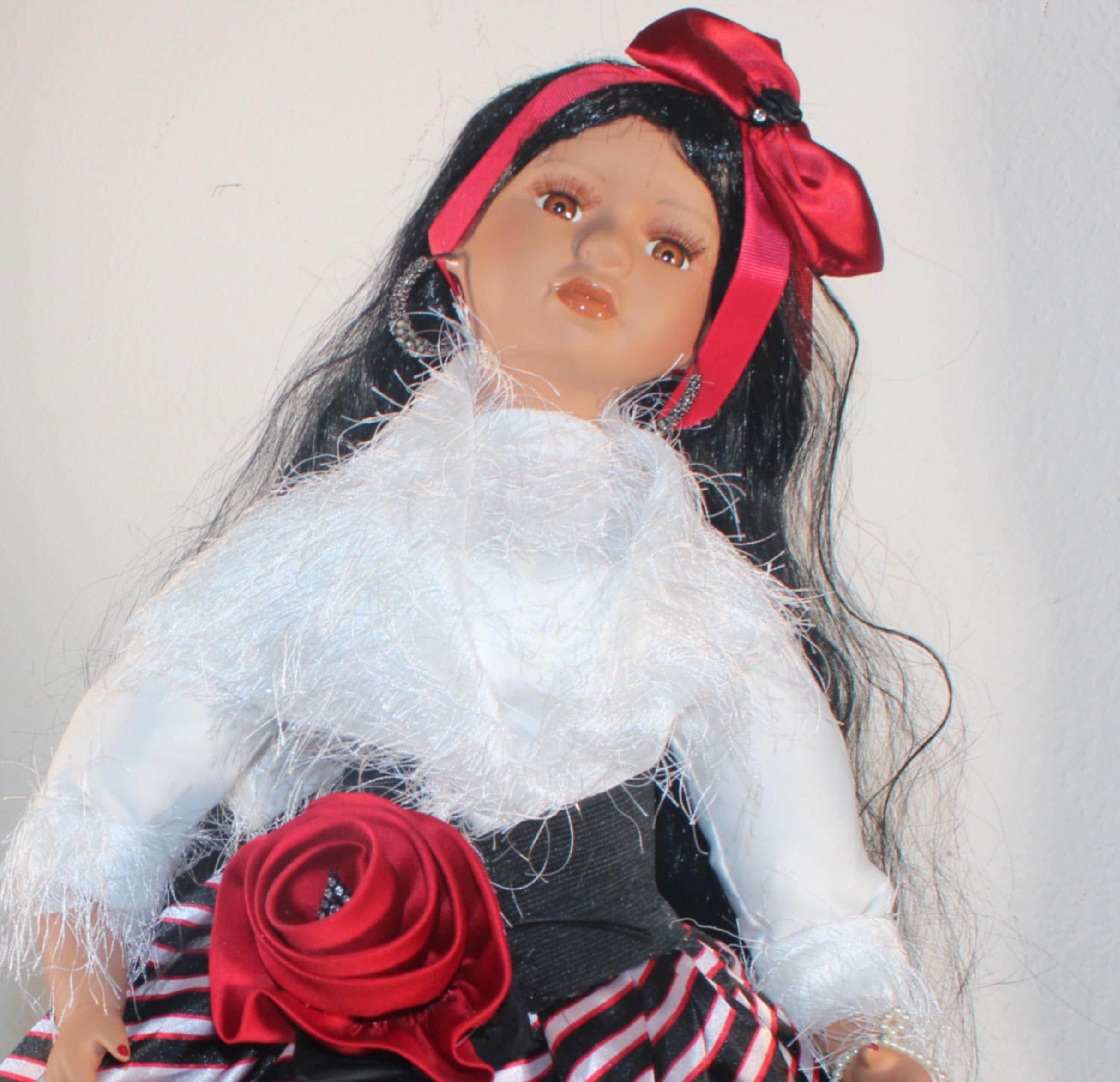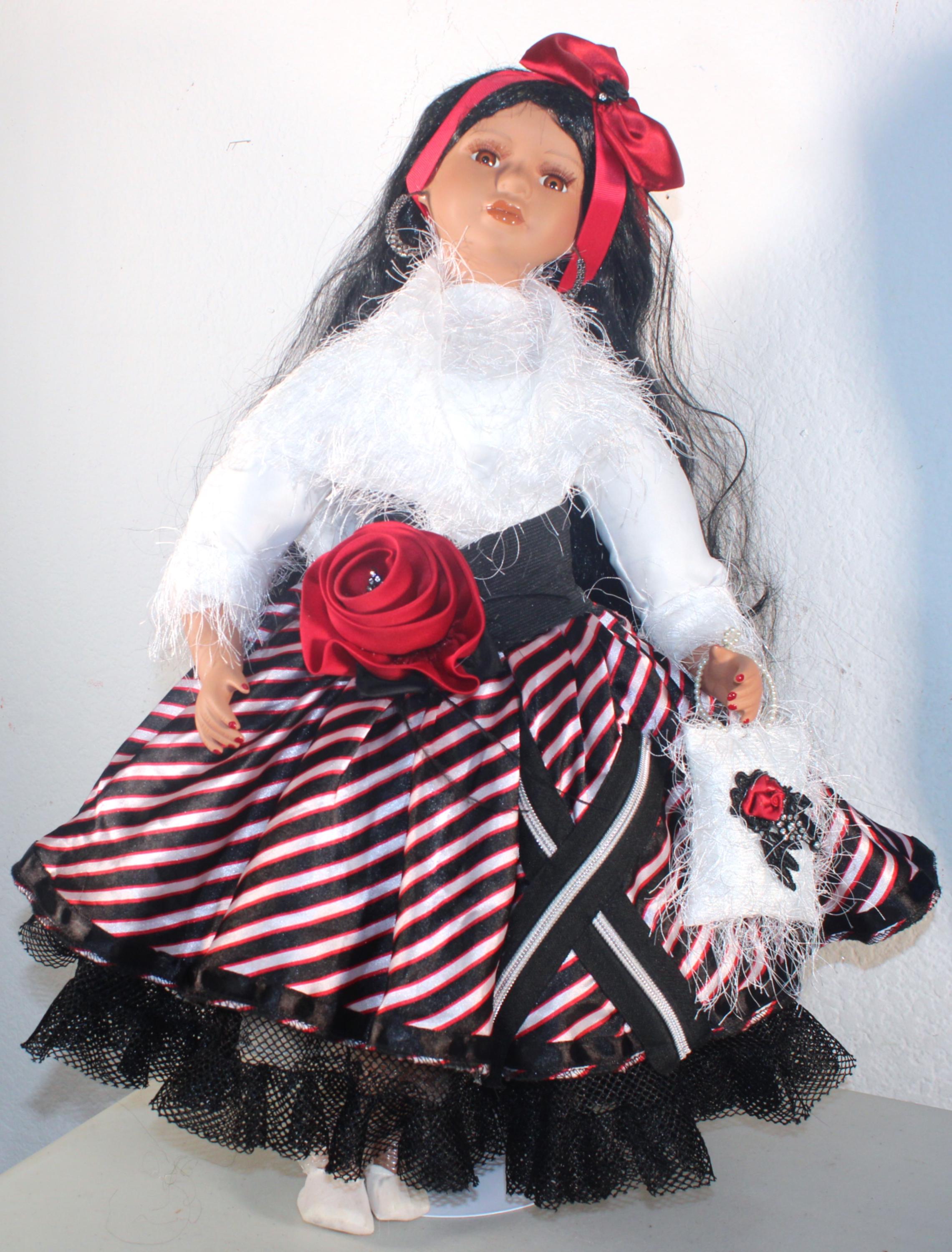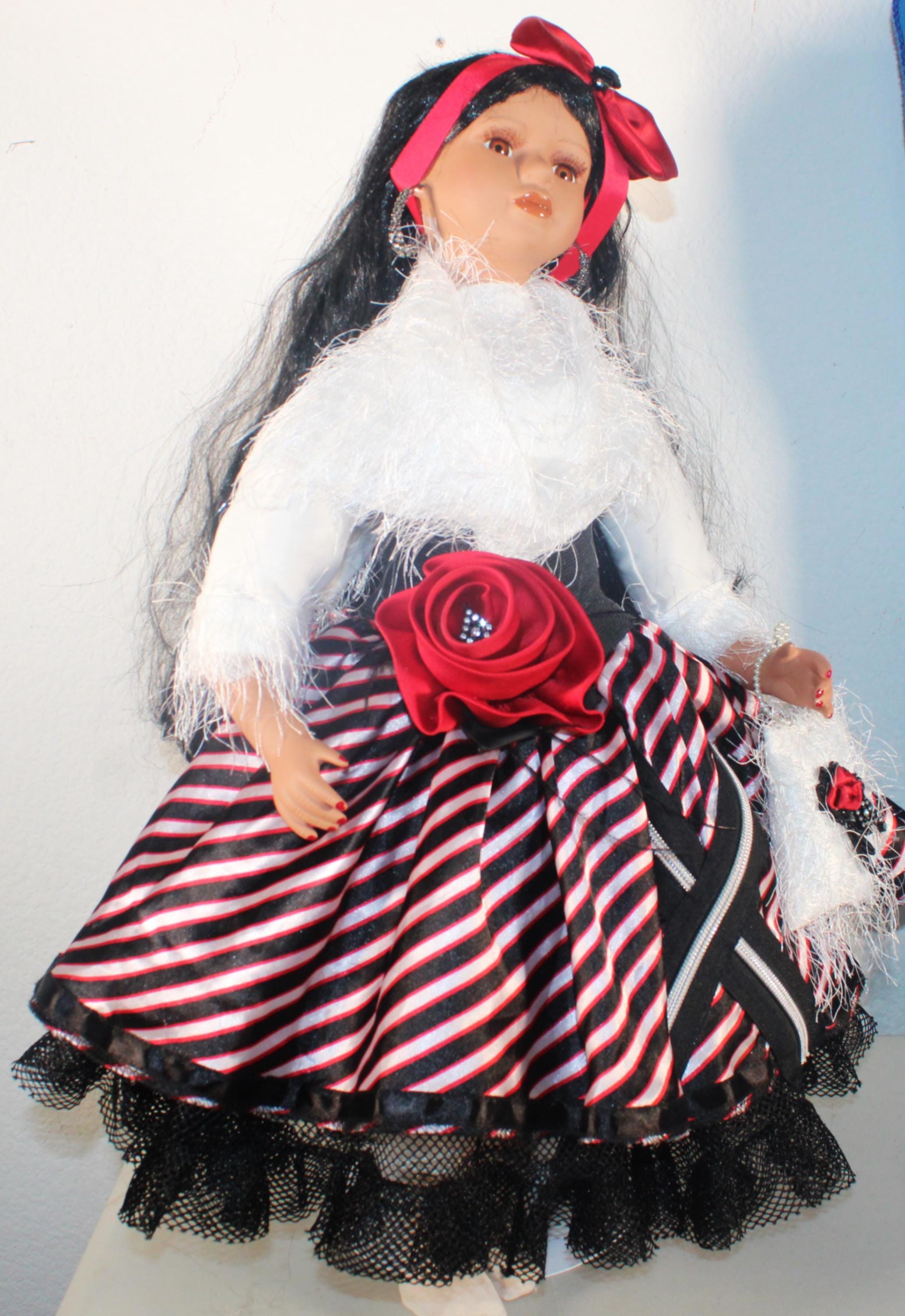 EDEN.. A tall 22" Porcelain African American doll. Dressed beautifully black, red and white, accented with a large red flower at waist. Just a touch of bling and a long sleeved fringed top with a full skirted bottom. Long black wavy hair with a matching headband. Matching handbag in hand. Big beautiful brown eyes. Made of porcelain and fabric. Sure to add glamour and class to your doll collection.