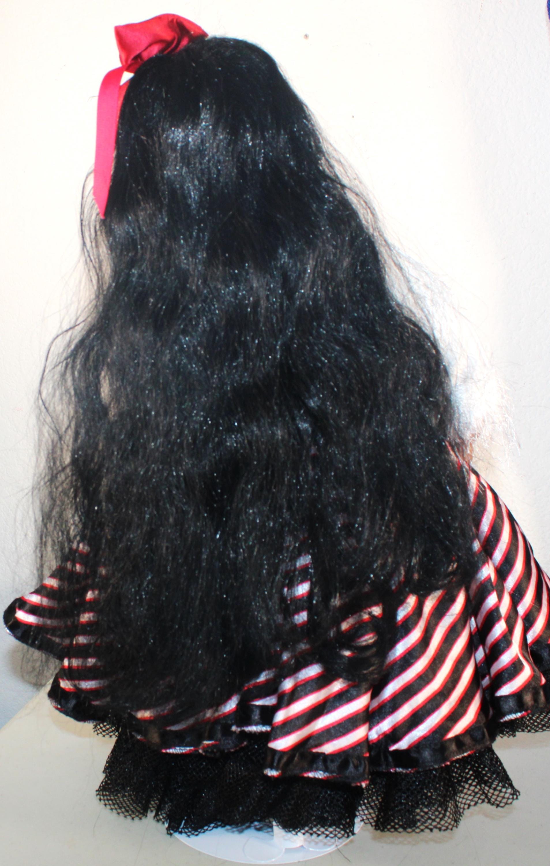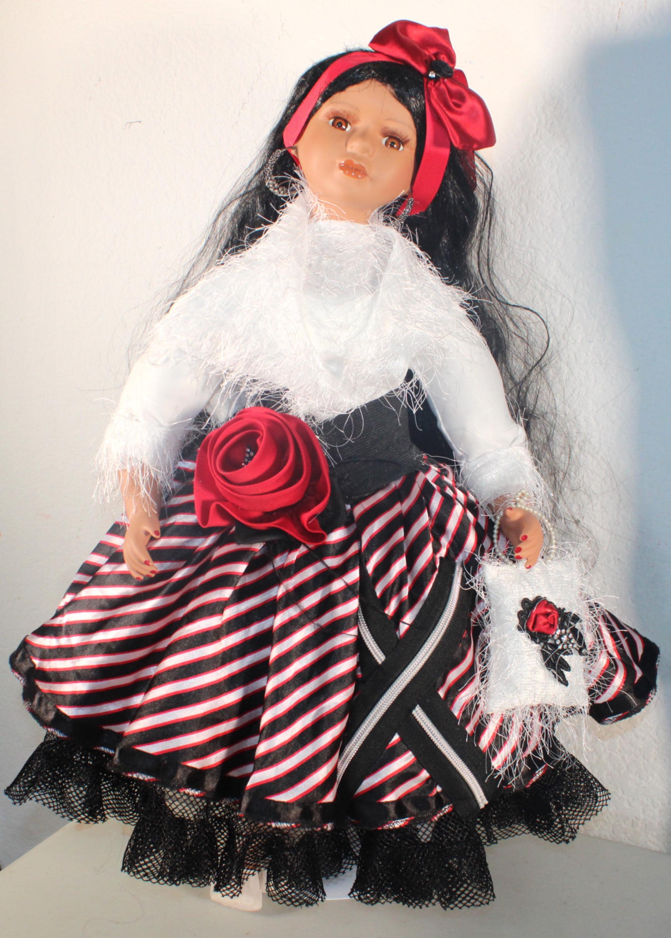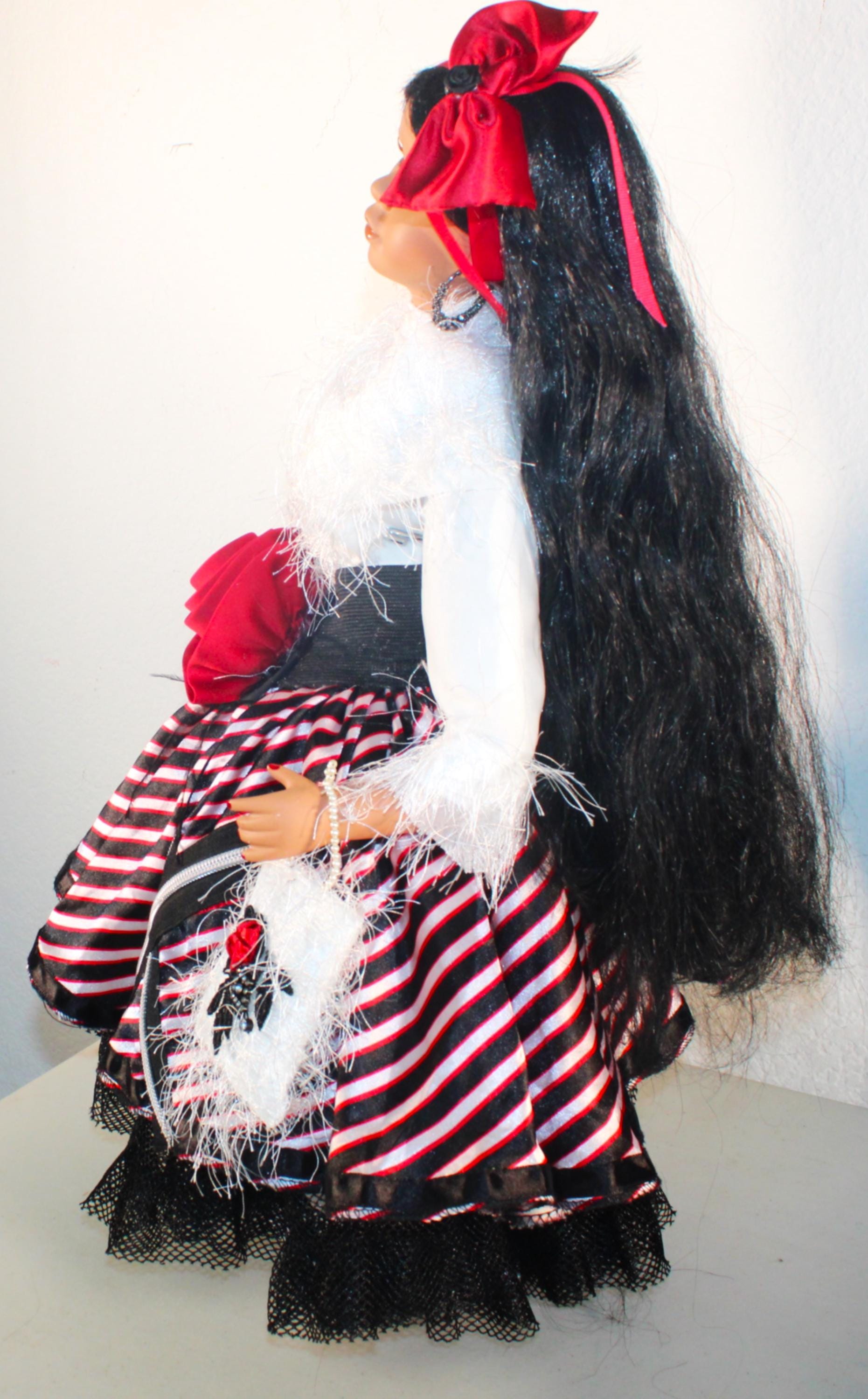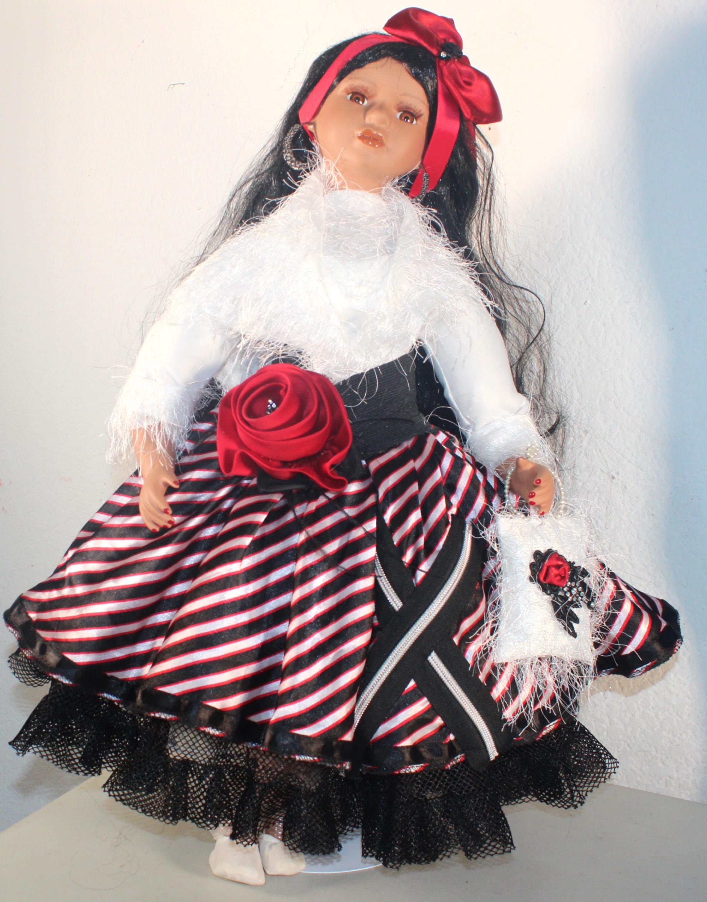 EDEN.. A tall 22" Porcelain African American doll. Dressed beautifully black, red and white, accented with a large red flower at waist. Just a touch of bling and a long sleeved fringed top with a full skirted bottom. Long black wavy hair with a matching headband. Matching handbag in hand. Big beautiful brown eyes. Made of porcelain and fabric. Sure to add glamour and class to your doll collection.