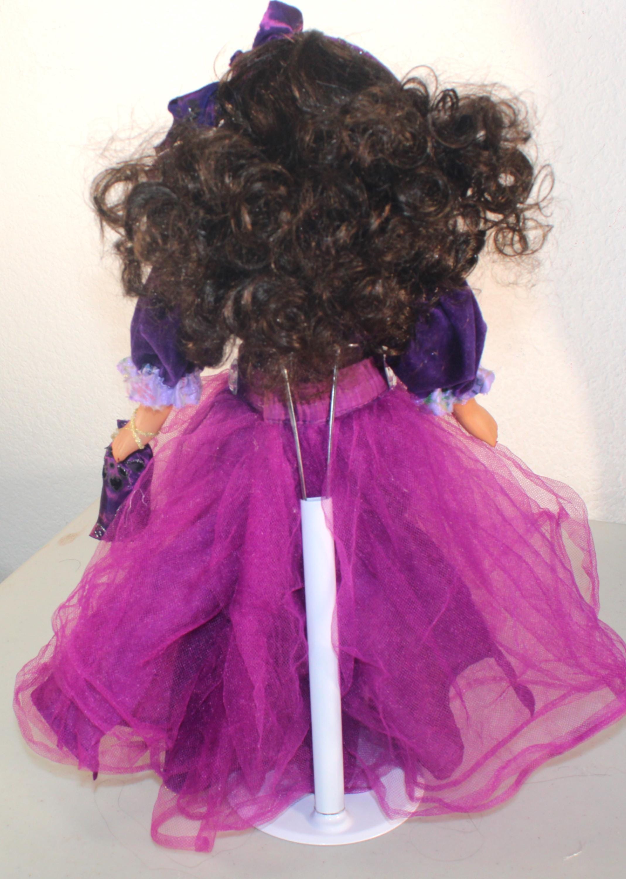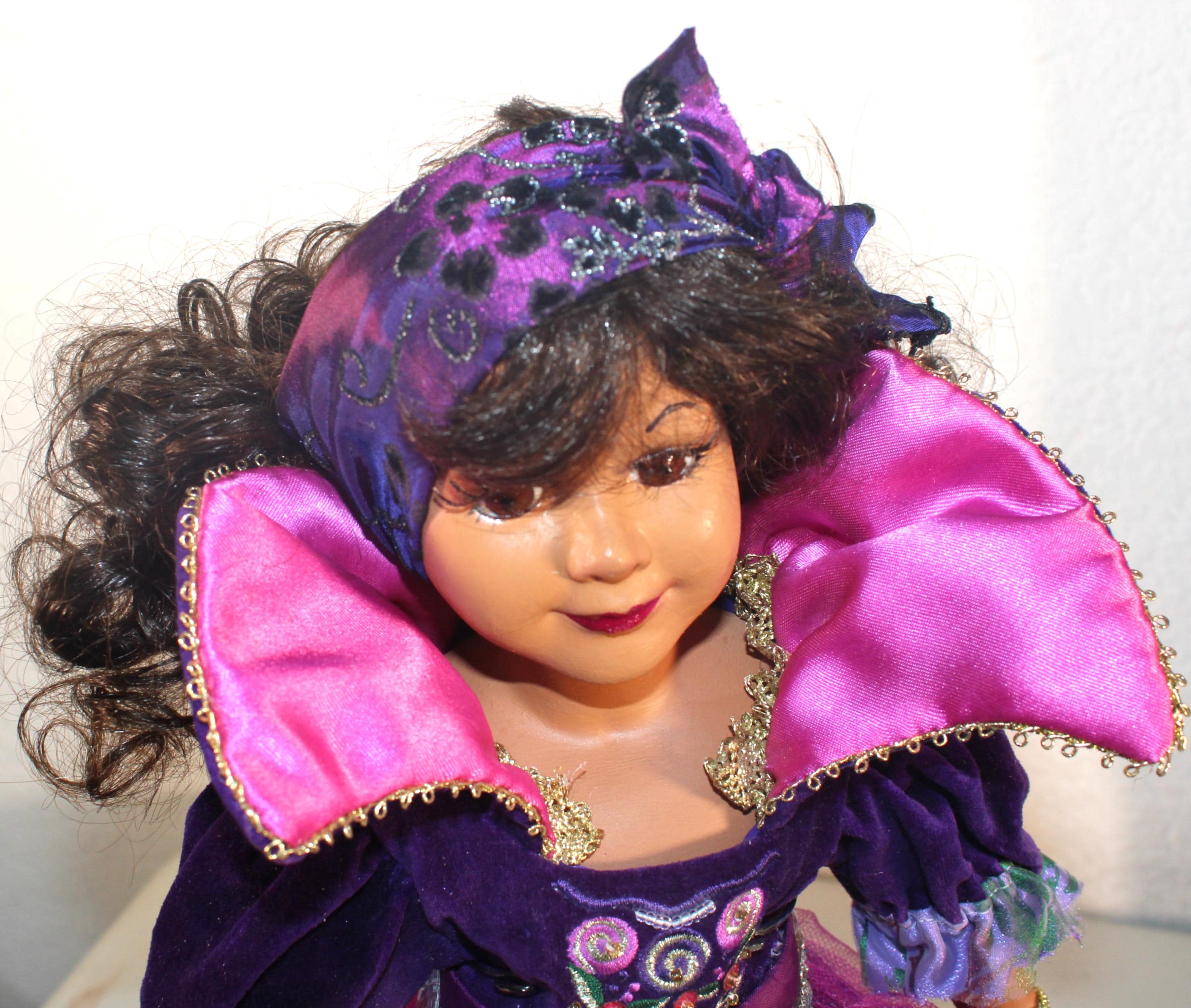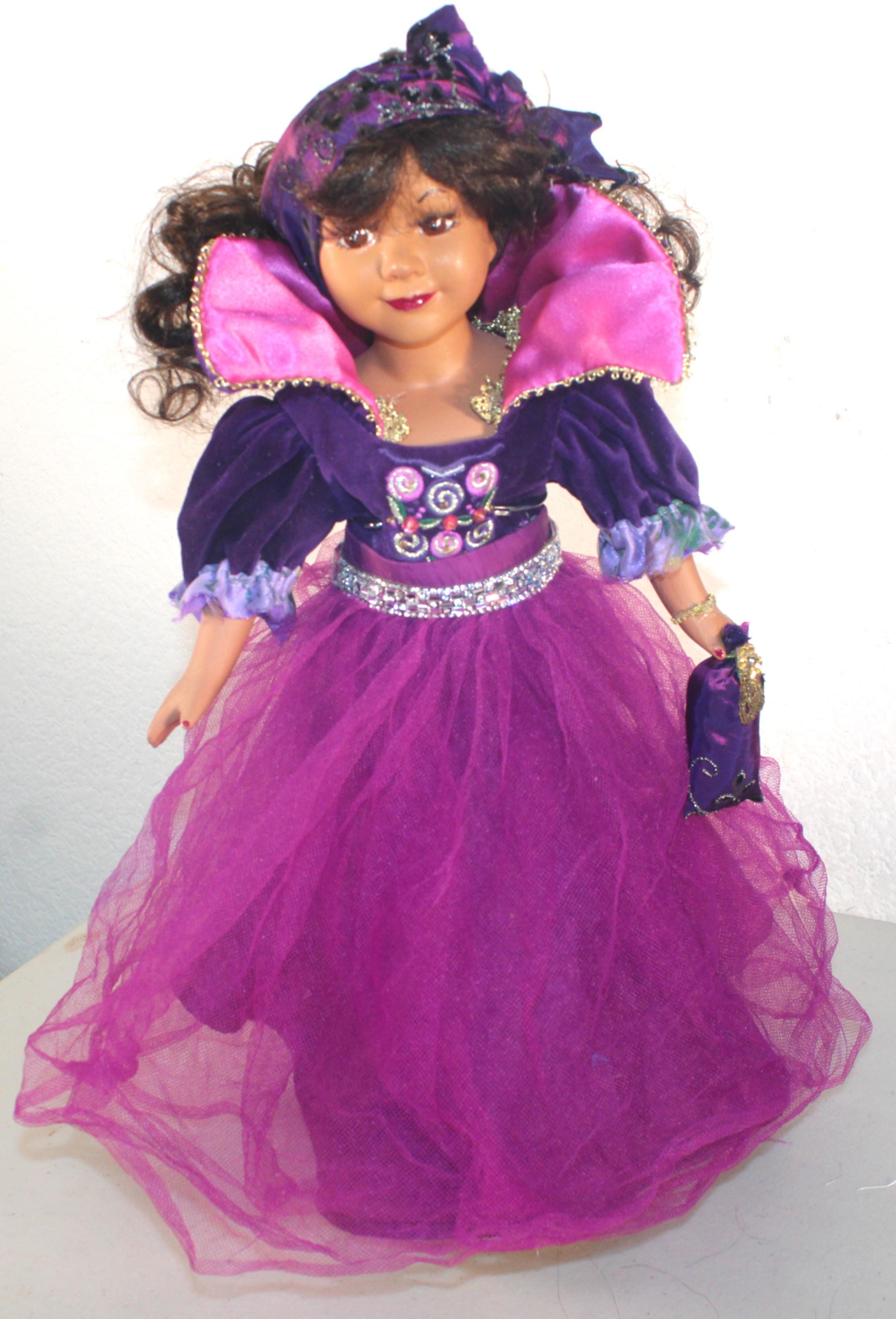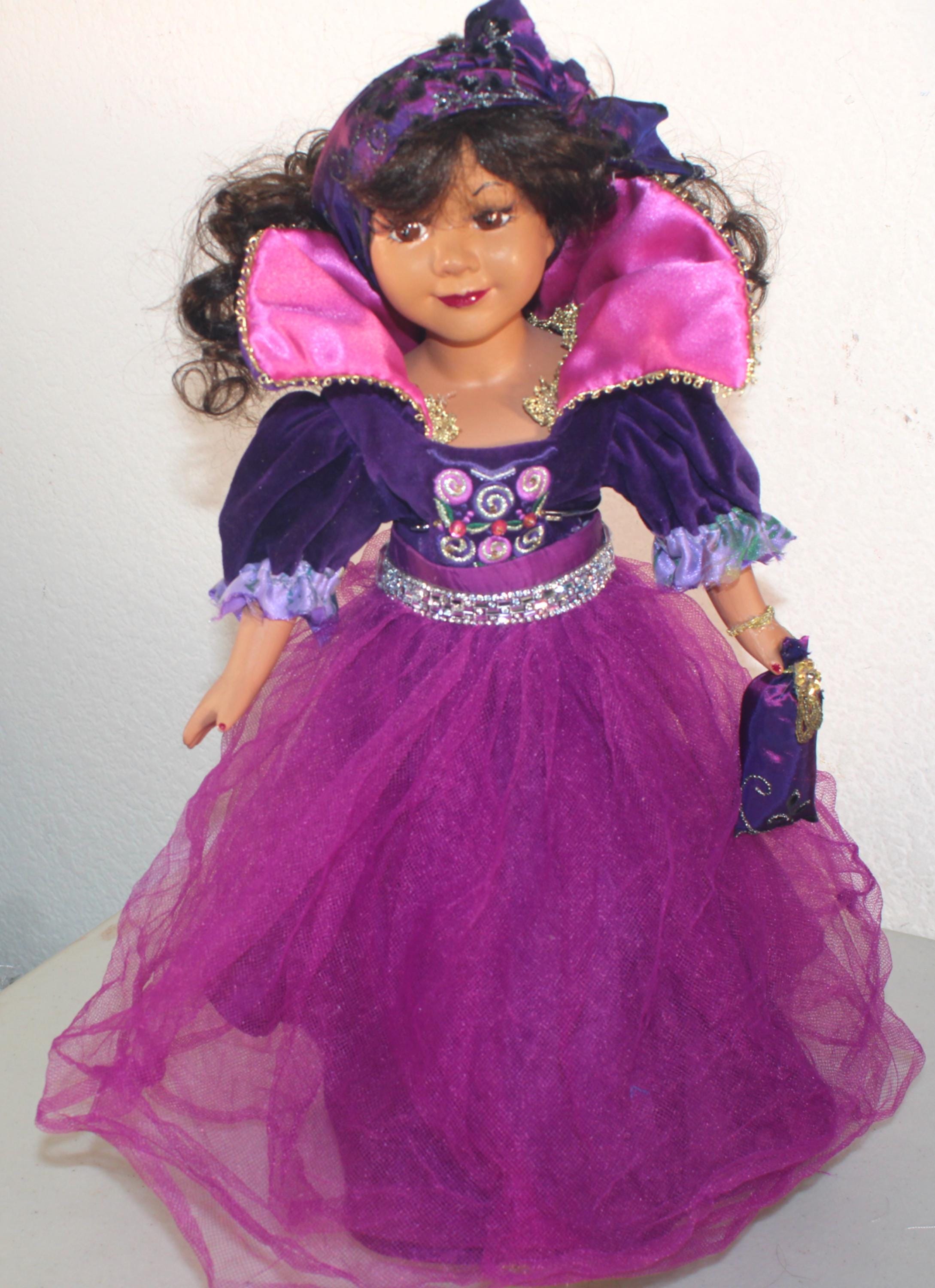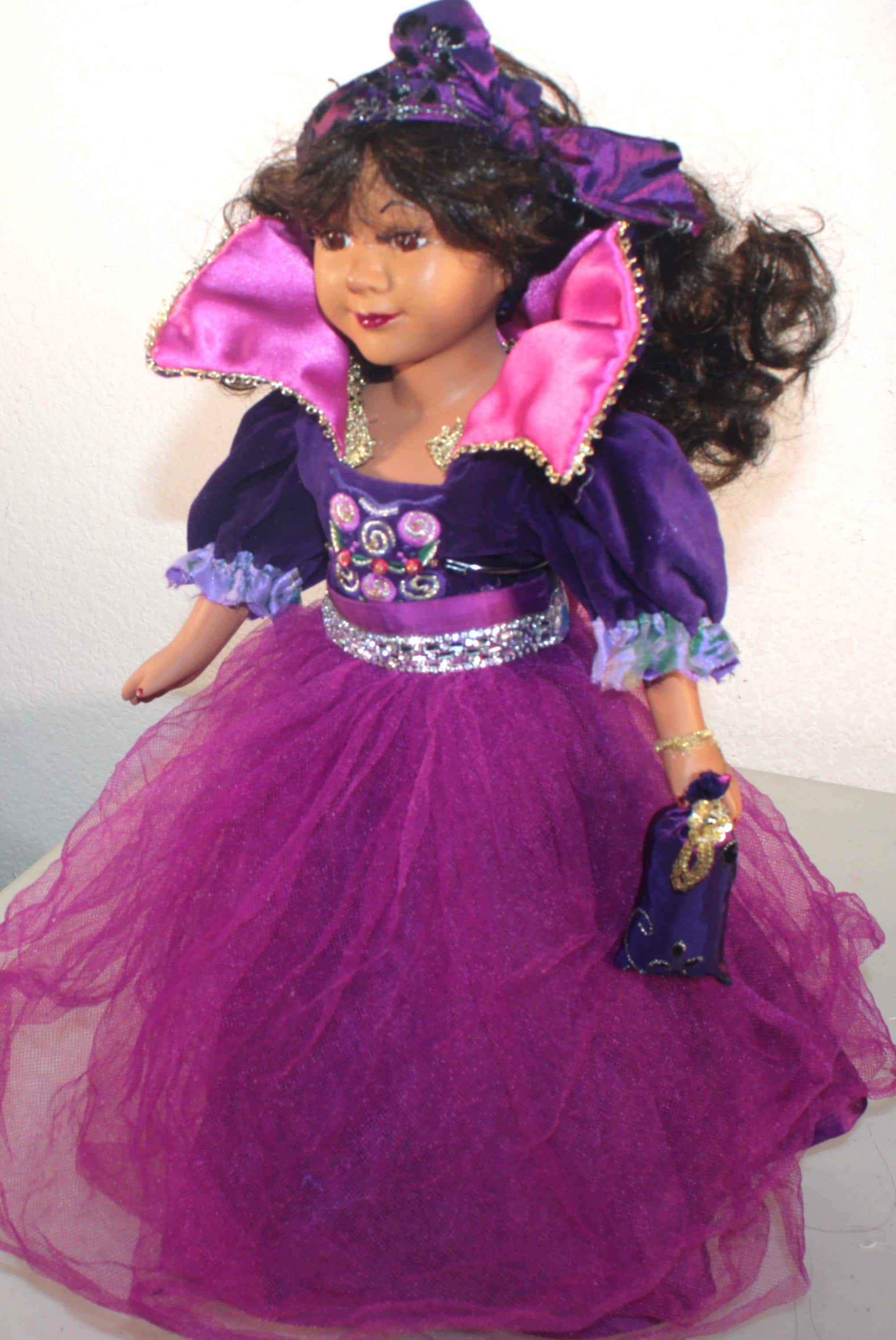 NICHELLE....An African American Porcelain doll 16". Dressed in purples with just a touch of bling. . Long dark brown curly hair with headband. Bright brown eyes. Matching handbag. Made of handpainted porcelain and fabric.