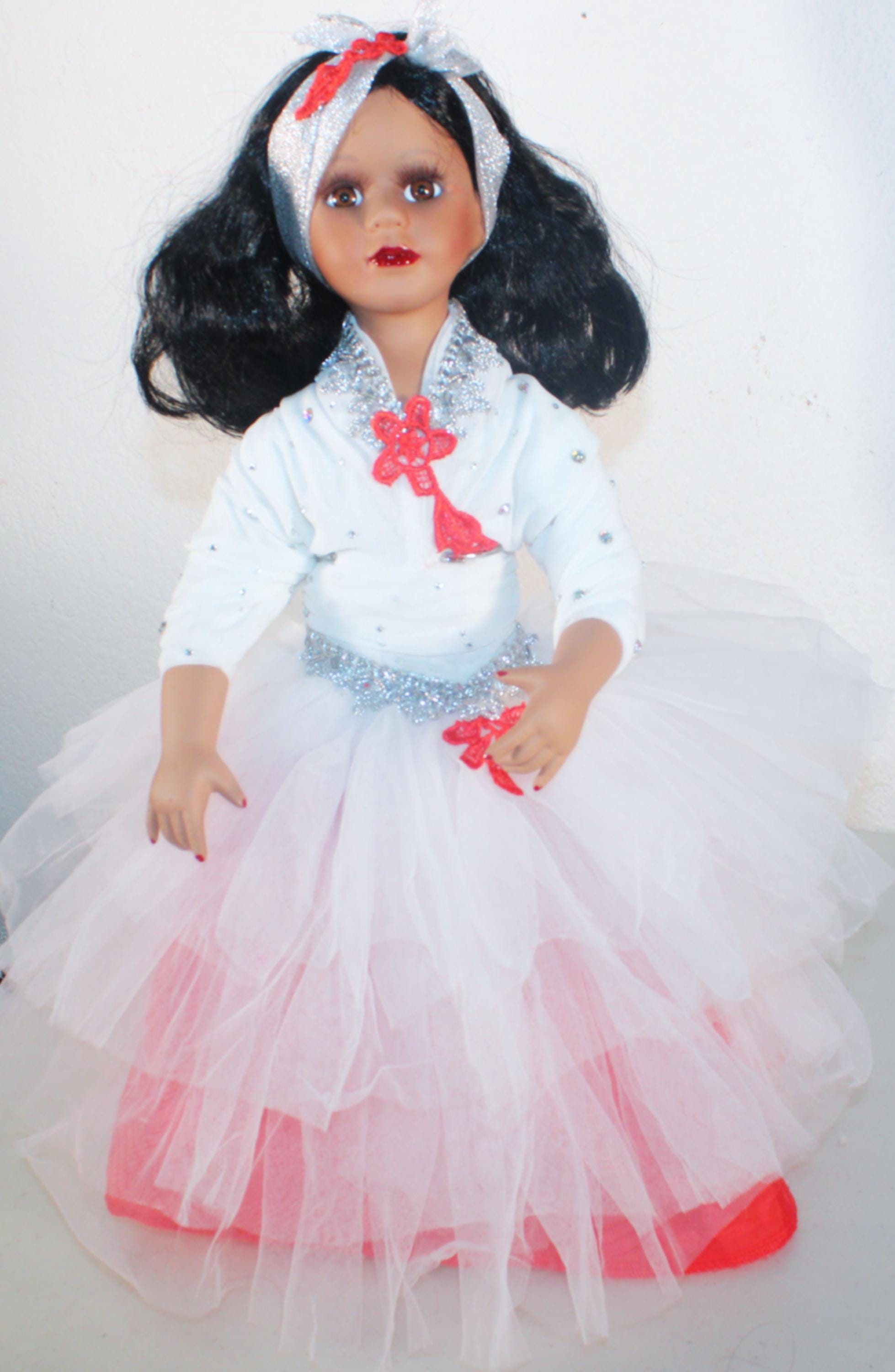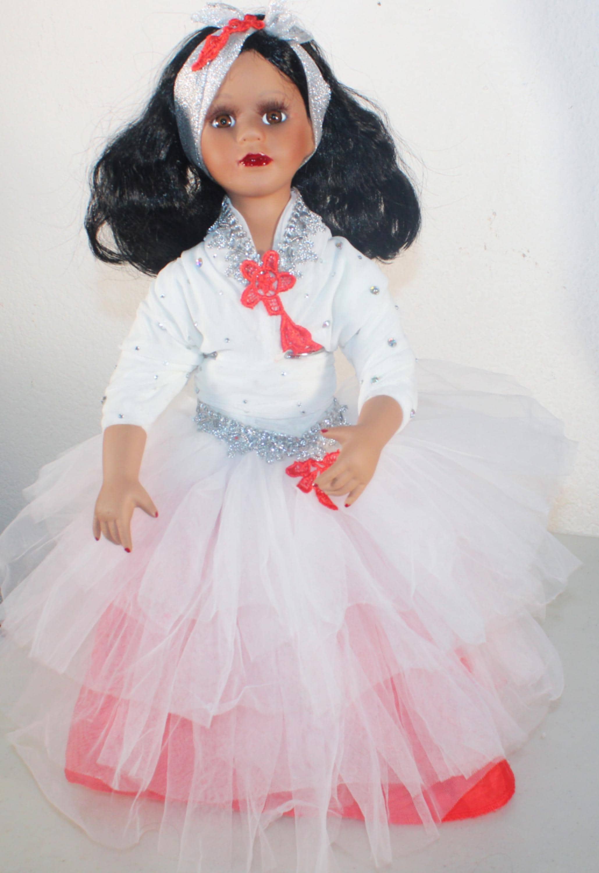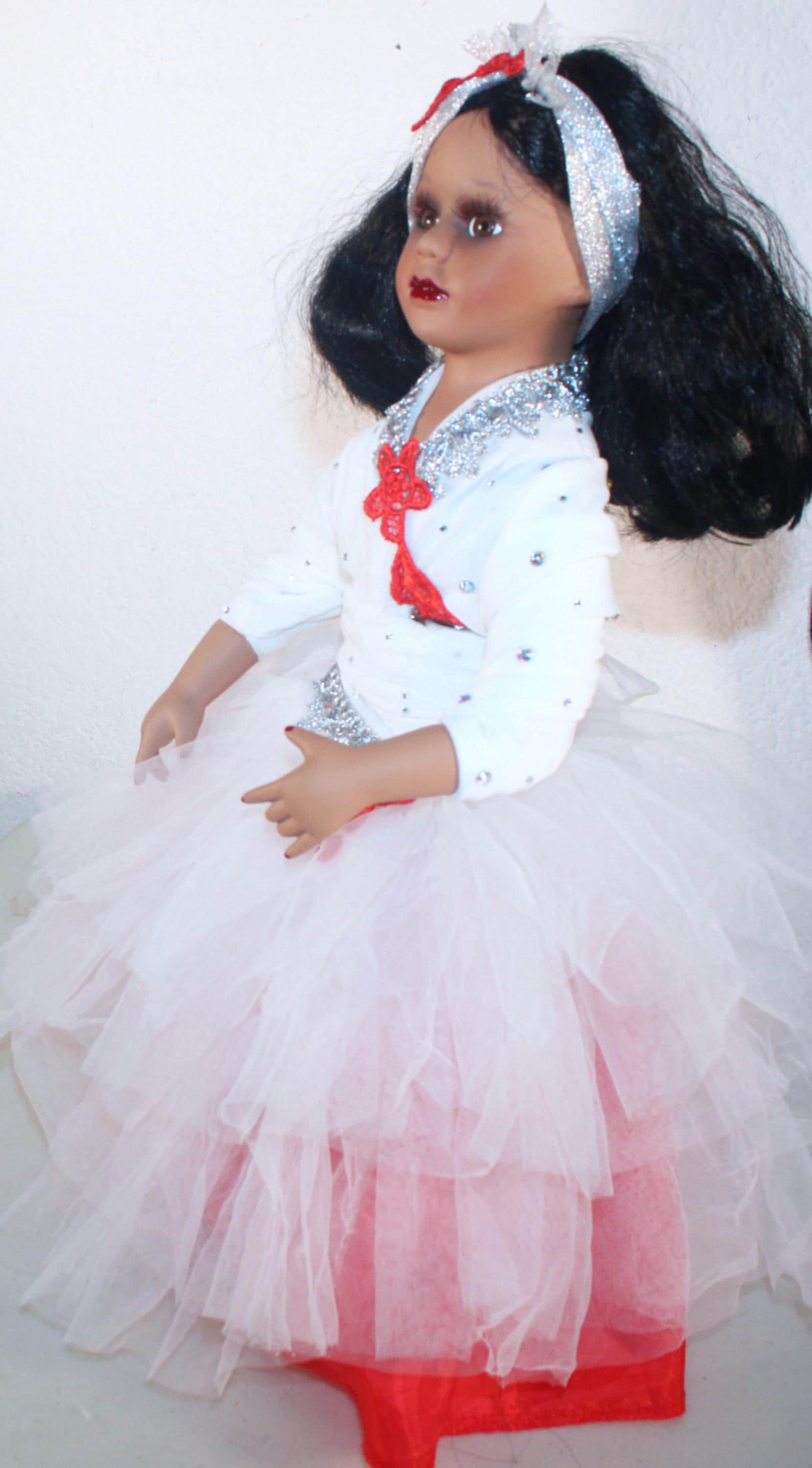 YAKIRA.. An exotic Porcelain African American 17" doll in a red and white tulle party dress, accented with silver and a scattering of irridescent rhinestones. Shoulder length wavy black hair with headband. Beautiful brown eyes. Made of porcelain and fabric. Sure to add glamour and class to your doll collection.