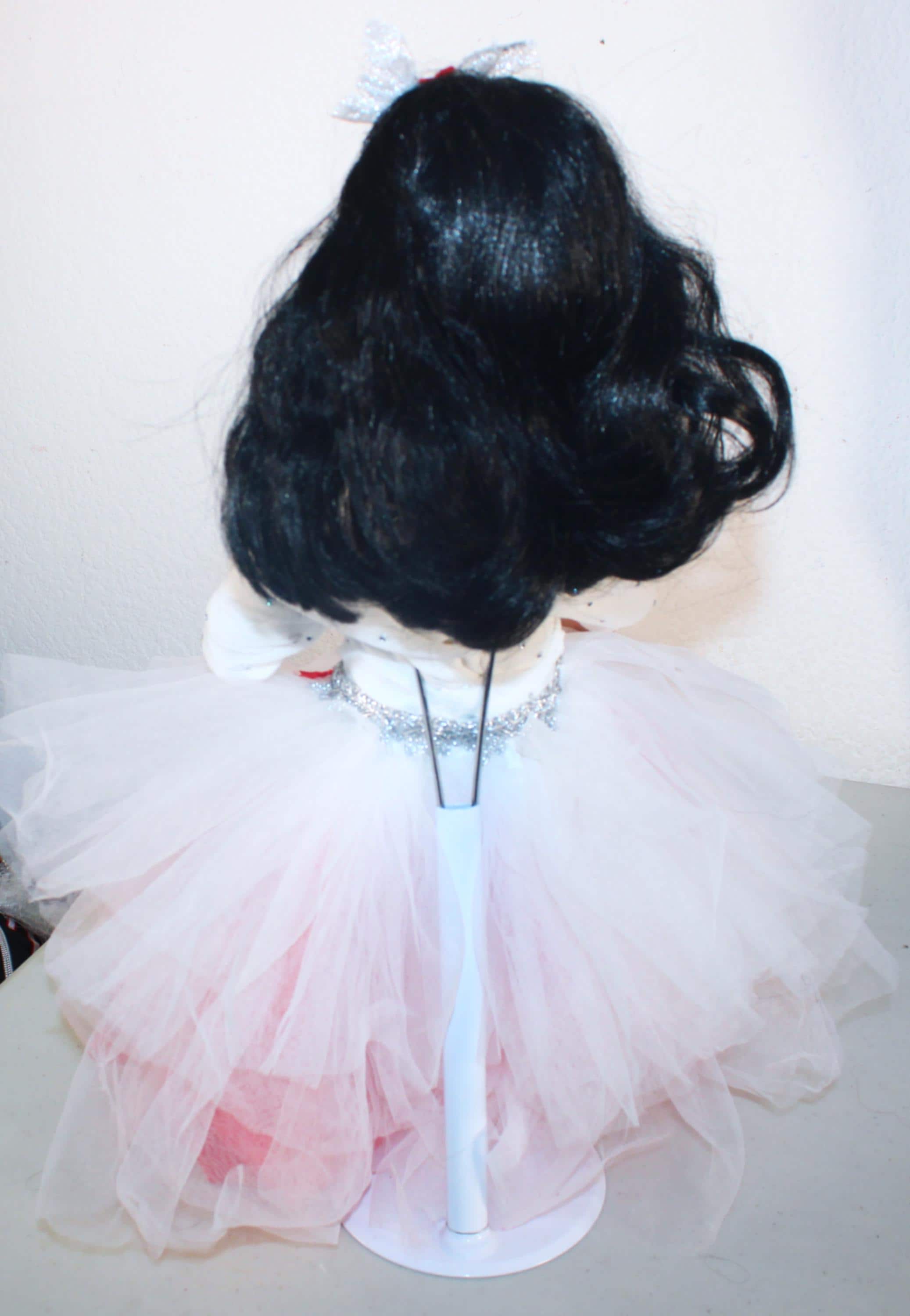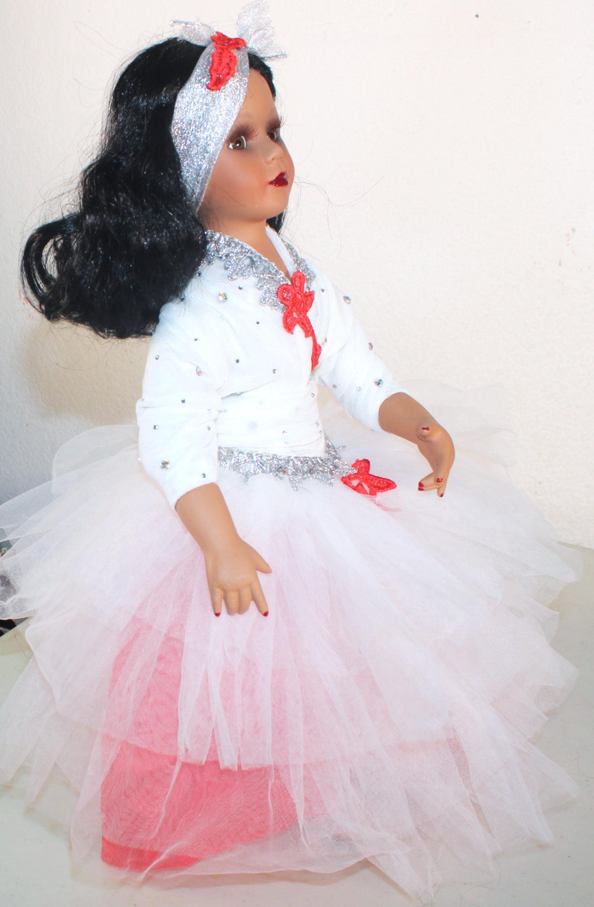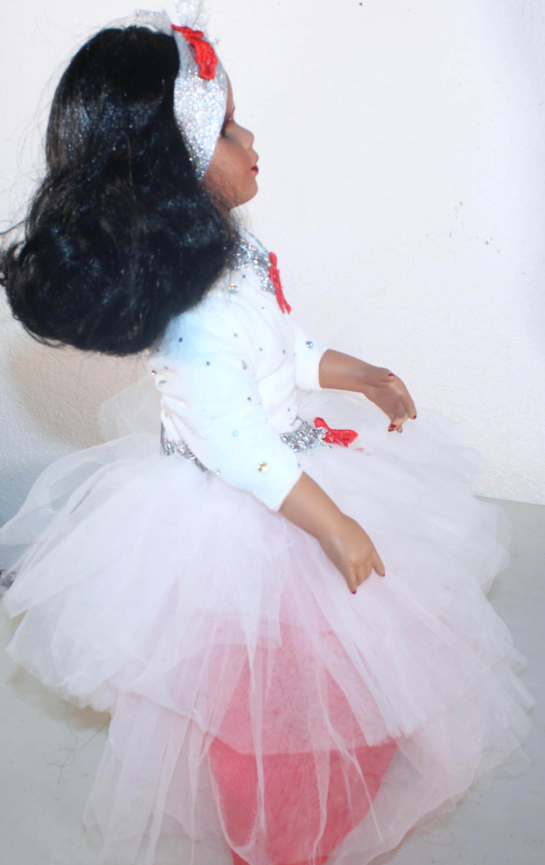 YAKIRA.. An exotic Porcelain African American 17" doll in a red and white tulle party dress, accented with silver and a scattering of irridescent rhinestones. Shoulder length wavy black hair with headband. Beautiful brown eyes. Made of porcelain and fabric. Sure to add glamour and class to your doll collection.